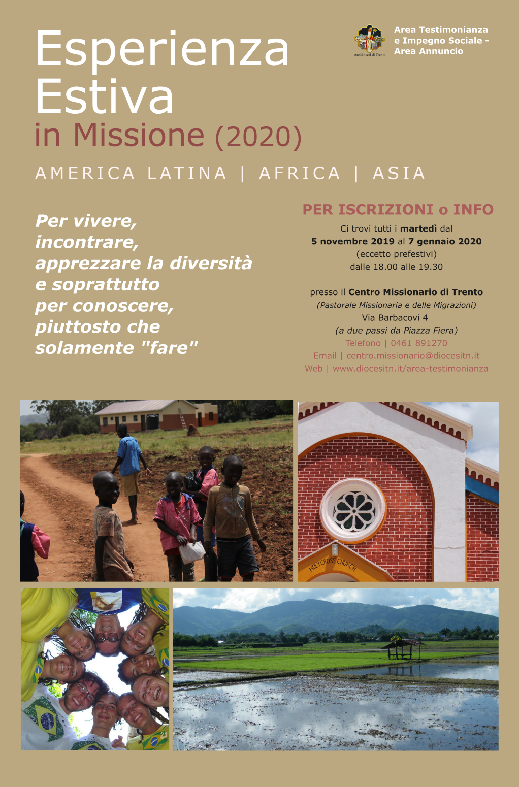 Tutti i martedì dal 5 novembre 2019 al 7 gennaio 2020 (eccetto prefestivi) dalle 18.00 alle 19.30 presso il Centro Missionario Diocesano a Trento in via Barbacovi 4.