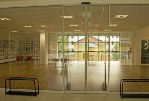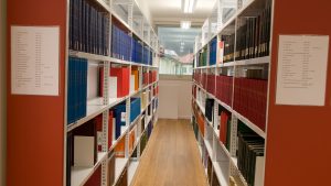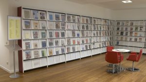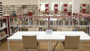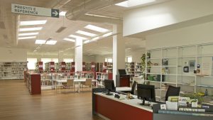 La sala lettura della Biblioteca con i libri a scaffale aperto