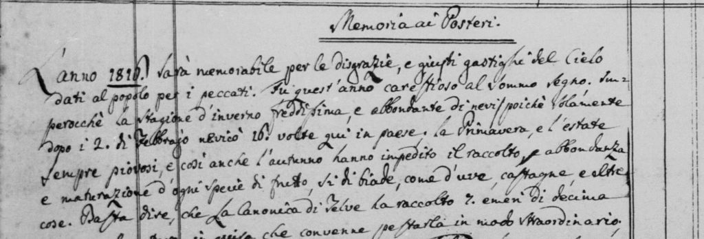 Lo scopo del progetto è verificare, attraverso la consultazione dei registri dei morti di alcune parrocchie trentine, quali ripercussioni ha avuto sulla popolazione della diocesi di Trento l’esplosione del vulcano Tambora e il cosiddetto “anno senza estate”. Oltre all’informatizzazione dei dati contenuti nei registri, i ragazzi sono chiamati ad analizzarli e a produrre delle ipotesi interpretative. Durante la settimana i ragazzi sono coinvolti anche nella digitalizzazione dei documenti, nella ricostruzione di alberi genealogici e nell’assistenza degli utenti in sala studio.