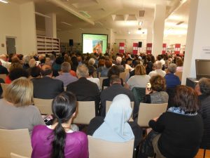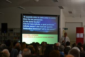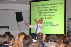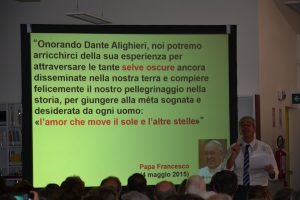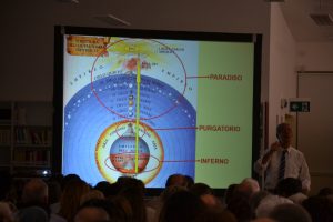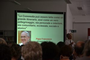 Dopo il benvenuto di monsignor Giulio Viviani e della direttrice Paola Tomasi, il professor Vivaldelli ha portato il pubblico a seguire il viaggio di Dante nella Divina Commedia con il suo commento entusiasta dei primi due Canti dell’Inferno.