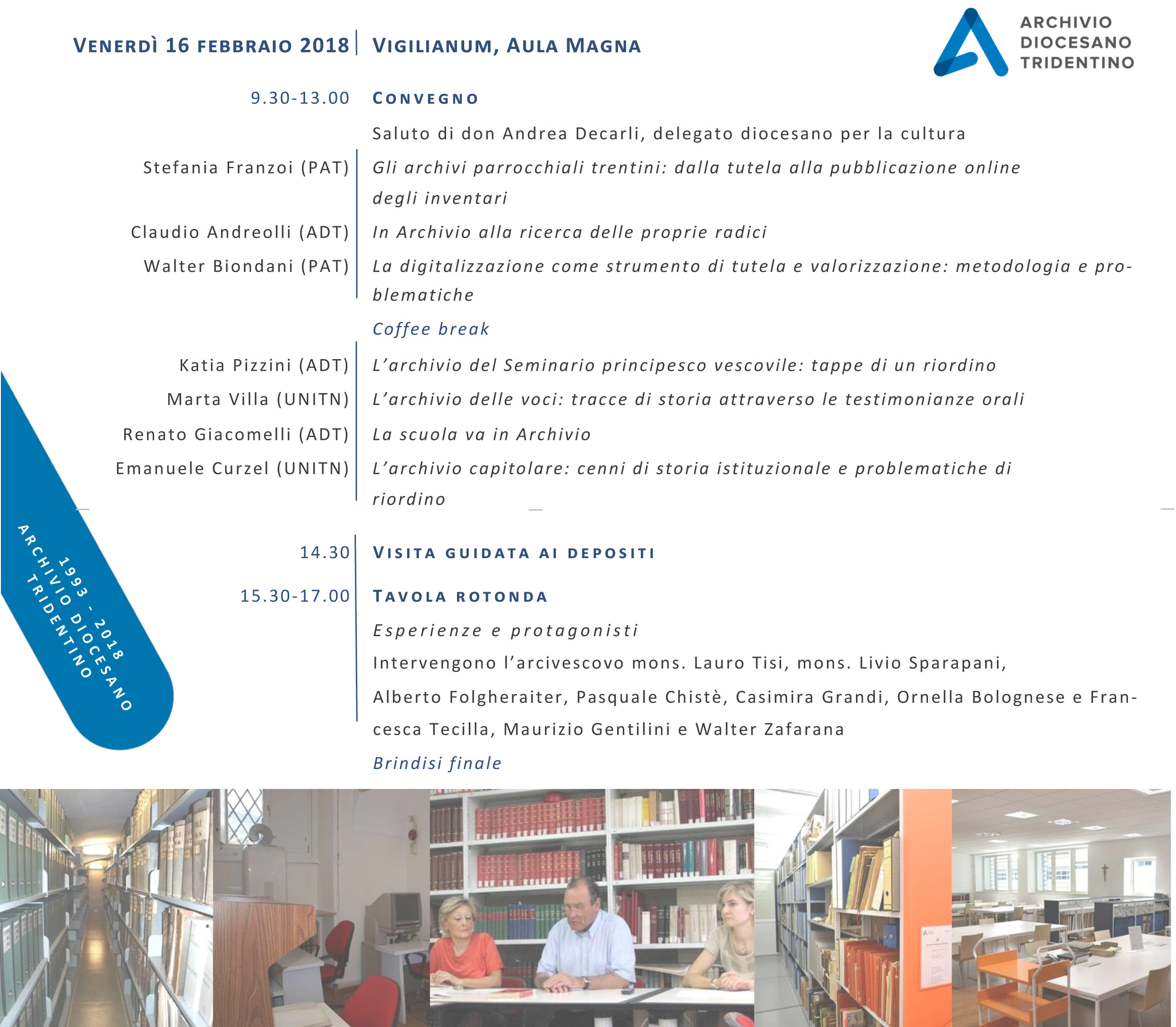 Il 10 febbraio 1993 con decreto dell’arcivescovo mons. Giovanni Maria Sartori (prot. n. 128/93/E) venne ufficialmente istituito l’Archivio Diocesano Tridentino. Nella ricorrenza del 25. anniversario dalla sua costituzione, l’Archivio ha organizzato una giornata di studio venerdì 16 febbraio. Al mattino si è tenuto un convegno con la presentazione delle attività, dei progetti, delle collaborazioni in corso. Al pomeriggio, dopo una visita guidata ai depositi, c’è stata una tavola rotonda riguardante le esperienze e i protagonisti di questi 25 anni.
