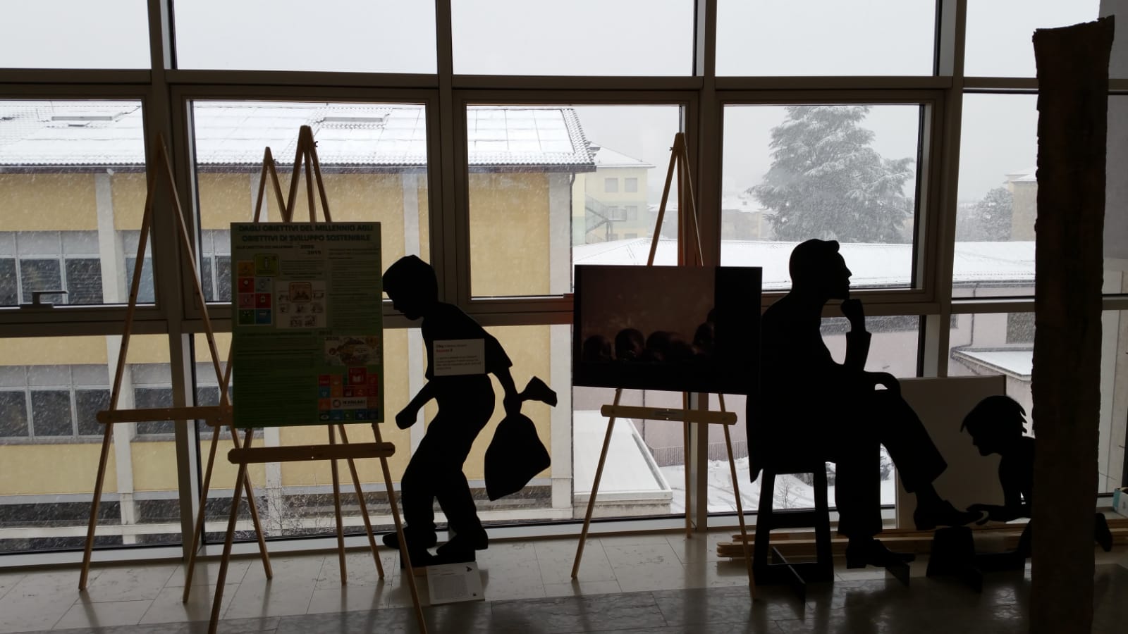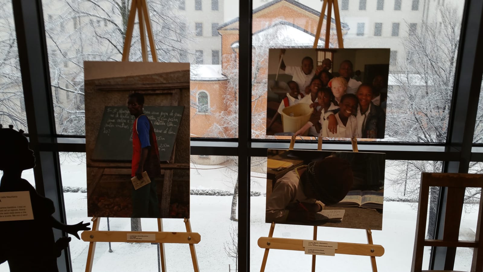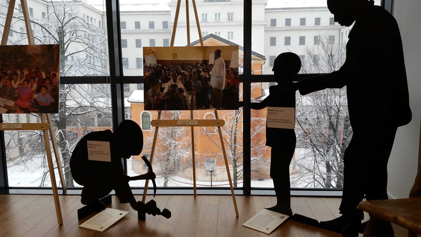 Lo spazioso atrio interno della Biblioteca accoglie l’installazione composta da sedie e tappeti che simbolizzano l’accoglienza declinata secondo le diversità culturali, libri scolastici provenienti da tutto il mondo e fotografie delle realtà scolastiche dei paesi in cui l’Associazione è presente (Mozambico e Mali). Distribuite tra i vari elementi dell’installazione delle sagome nere in dimensione reale evocano i bambini non scolarizzati – bambini lavoratori o soldato, portatori di handicap, spose bambine… – e denunciano l’assenza del diritto all’istruzione.
