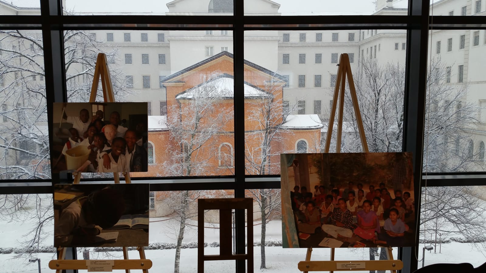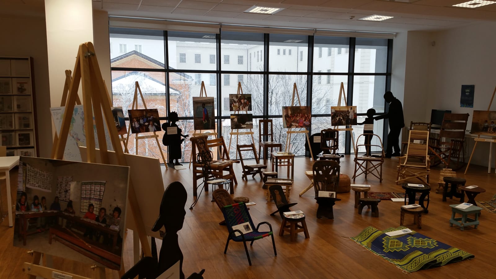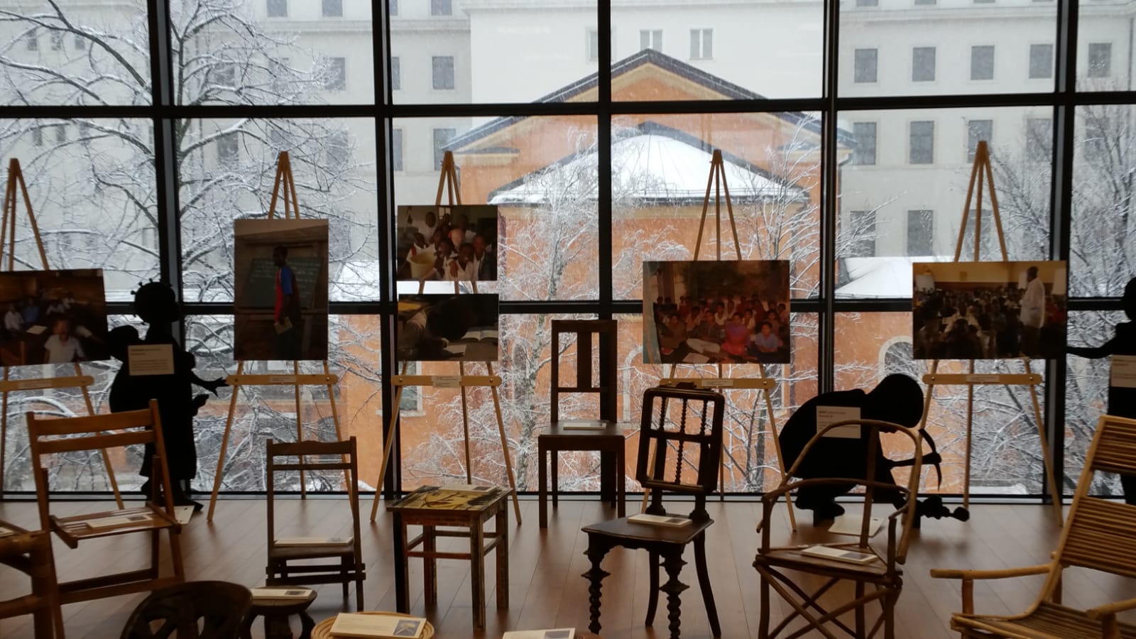 Lo spazioso atrio interno della Biblioteca accoglie l’installazione composta da sedie e tappeti che simbolizzano l’accoglienza declinata secondo le diversità culturali, libri scolastici provenienti da tutto il mondo e fotografie delle realtà scolastiche dei paesi in cui l’Associazione è presente (Mozambico e Mali). Distribuite tra i vari elementi dell’installazione delle sagome nere in dimensione reale evocano i bambini non scolarizzati – bambini lavoratori o soldato, portatori di handicap, spose bambine… – e denunciano l’assenza del diritto all’istruzione.