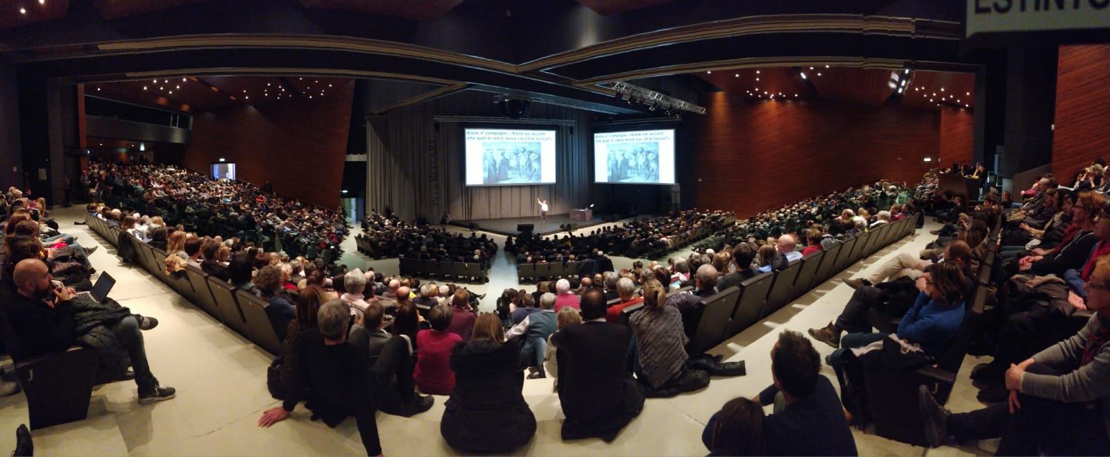 (13 febbraio) Almeno 1500 persone (QUI IL LINK ALLA FOTOGALLERY) hanno affollato nella serata di martedì 12 febbraio il PalaRotari di Mezzocorona per seguire Gregorio Vivaldelli nella nuova tappa nel lungo viaggio alla scoperta della Divina Commedia proposto dall’Arcidiocesi di Trento  su organizzazione della Biblioteca Vigiluanum. Vivaldelli si conferma  capace di attirare e coinvolgere un pubblico di ogni età, in cui spicca la presenza di tanti giovani, seduti proprio davanti all’arcivescovo Lauro che non  ha voluto mancare all’appuntamento diocesano dal titolo “Con il bene vinci il male“.