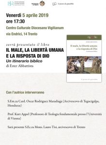 Venerdì 5 aprile 2019 presso il Vigilianum (via Endrici, 14 – Trento) è stato presentato il libro di Ester Abbattista: Il male, la libertà umana e la risposta di Dio. Un itinerario biblico