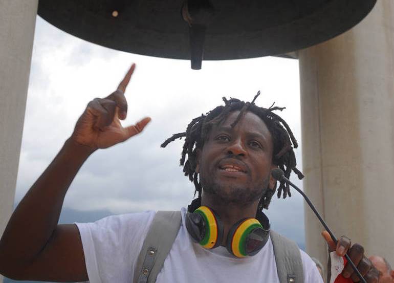 Nella foto Zotta John Mpaliza davanti alla Campana dei caduti di Rovereto
