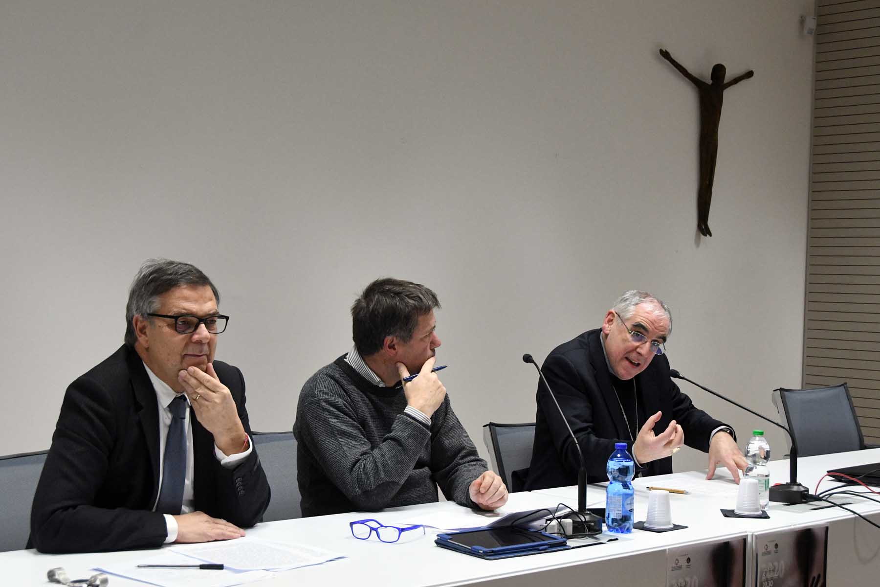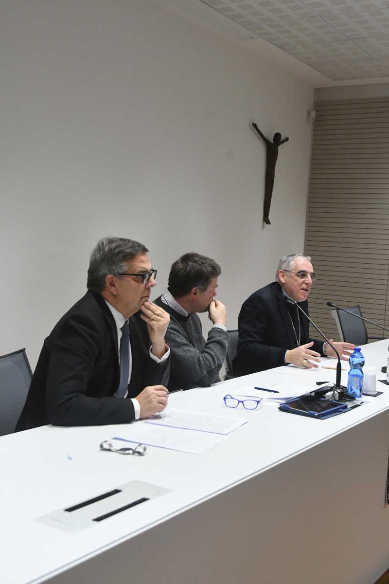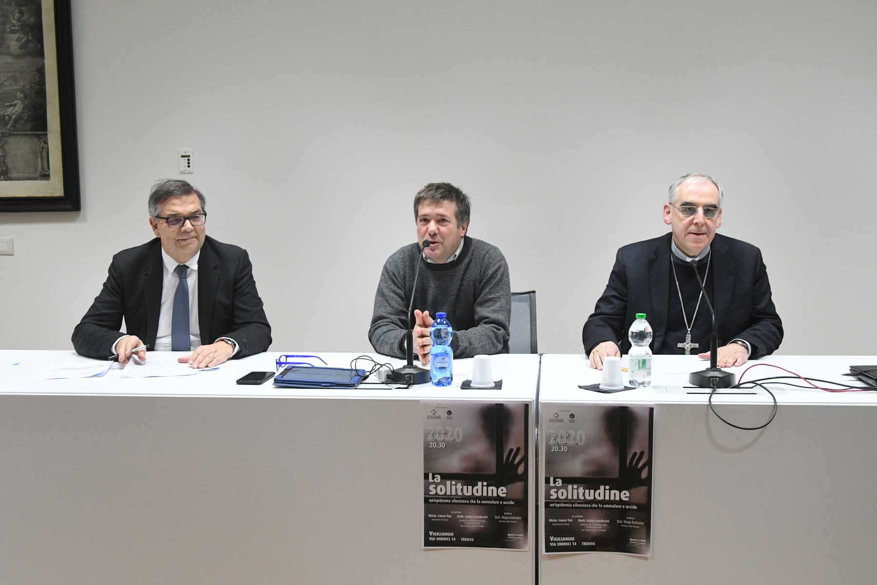 Da sinistra: Fabio Cembrani,  Direttore medicina legale Trento; Diego Andreatta, direttore  di Vita Trentina; monsignor Lauro Tisi arcivescovo di Trento alla serata “La solitudine un epidemia silenziosa che fa ammalare e uccide” – Trento Vigilianum (foto Daniele Panato/Agenzia Panato)