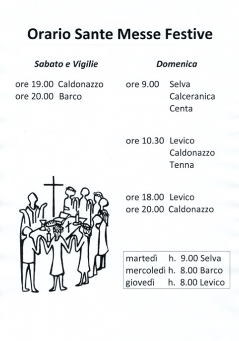 Zona della Valsugana e Primiero PERGINE (messe festive e messe feriali) CIVEZZANO LEVICO – LAGHI BORGO e VALSUGANA ORIENTALE ALTOPIANO DI PINE’ SANTUARIO DI MONTAGNAGA FOLGARIA PRIMIERO – VANOI – MIS VALLE DEI MOCHENI