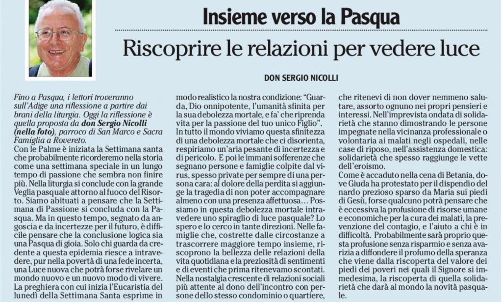 Possiamo in questa debolezza mortale intravedere uno spiraglio di luce pasquale? Lo spero e lo cerco in tante direzioni. Nelle famiglie che, costrette dalle circostanze a trascorrere maggiore tempo insieme, riscoprono la bellezza delle relazioni della vita quotidiana e la preziosità di sentimenti e di eventi che prima ritenevamo scontati. Nella nostalgia crescente di relazioni sociali più attente al dono dell’incontro con persone dello stesso condominio o quartiere, che ritenevi di non dover nemmeno salutare, assorto ognuno nei propri pensieri e interessi. Nell’imprevista ondata di solidarietà che stanno dimostrando le persone impegnate nella vicinanza professionale o volontaria ai malati negli ospedali, nelle case di riposo, nell’assistenza domestica: solidarietà che spesso raggiunge le vette dell’eroismo.