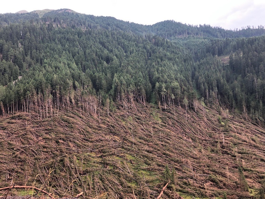 Nella foto la devastazione di alberi provocata dalla tempesta Vaia in val di Fiemme, nella zona di passo Lavazè.