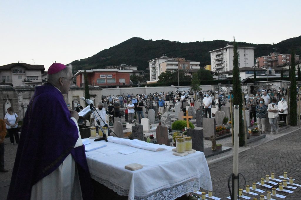 La speranza è documentata da monsignor Tisi nell’omelia, a partire dal Vangelo di Giovanni (“Vi prenderò con me”) “che descrive la morte – spiega l’Arcivescovo – come un atto materno, visitato dall’amore. Dio, in Gesù Cristo, si fa compagno di chi muore per portarlo a casa.” “Abbiamo assistito in questi mesi – rammenta don Lauro – a un morire straziante senza la compagnia dei propri cari, un morire dominato dalla solitudine, disumano. In quel morire è arrivato il Signore della vita con il suo Spirito. A chi ha vissuto il dramma di un saluto frettoloso ai propri cari, dico che sono stati condotti con tenerezza nella dimora della luce e della pace“. “Se n’è andato il loro corpo – constata l’Arcivescovo – ma il bene che ci hanno voluto è più che mai vivo e presente. Quando parliamo dei nostri cari – fa notare don Lauro – non parliamo al passato, utilizziamo il presente perché l’amore è più forte della morte e non può essere consegnato all’oblio”. “Vorrei portaste a casa – conclude Tisi – la consolazione di pensare i vostri morti presenti nel Signore e nel suo morire gridando perdono, senza odio e consegnando solo l’amore”. “Signore della vita – è l’invocazione finale – donaci il sentirti presente e nell’ora della nostra morte regalaci la nascita alla pienezza della vita”.
