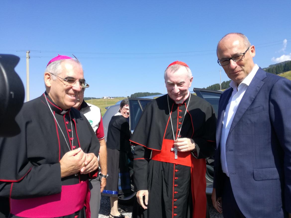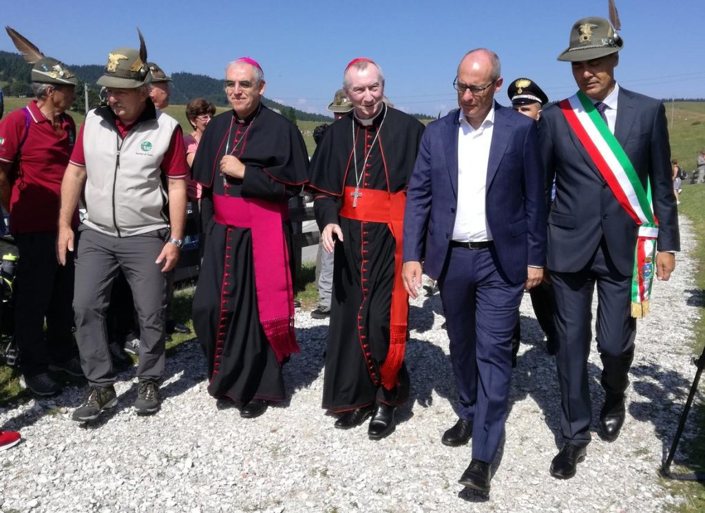 Dopo aver celebrato la Messa domenica al Tonale con il vescovo di Brescia mons. Tremolada, un altro importante appuntamento nel centenario della Guerra per l’Arcivescovo di Trento Lauro Tisi. È accaduto nella chiesetta alpina di Santa Zita a passo Vezzena, quasi un simbolo di pace con la sua storia e la sua ricostruzione dieci anni fa; domenica 5 agosto mons. Tisi ha concelebrato un’Eucaristia per i caduti di tutte le guerra, dal significato universale, assieme al cardinale Pietro Parolin, Segretario di Stato Vaticano, in Primiero per qualche giorno di vacanza ospite dall’amico parroco don Giuseppe Da Prà nella canonica di Siror.