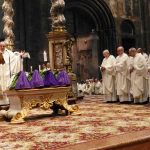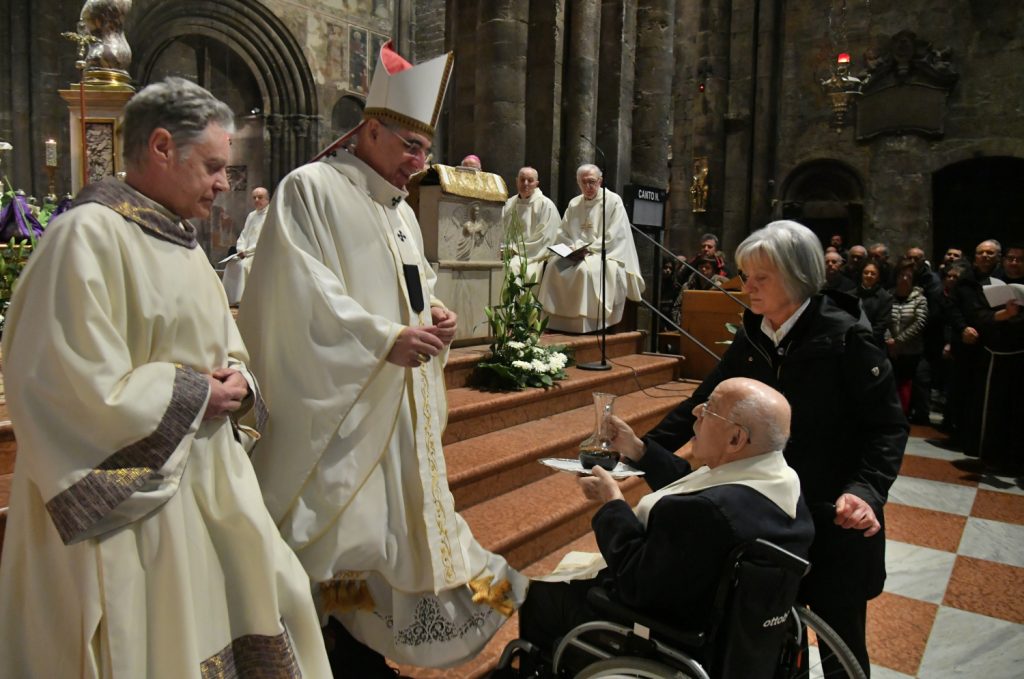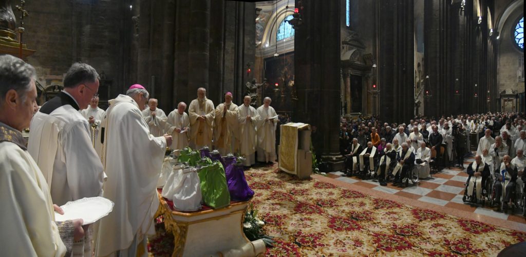 Nel corso della liturgia, animata dal coro dei preti giovani e con i confratelli infermi al centro della navata, sono stati anche benedetti gli olii santi: l’olio dei catecumeni (coloro che si preparano al Battesimo), il crisma (l’olio usato per Battesimo, Cresima e Ordine sacro, da cui prende nome anche la celebrazione odierna), l’olio per l’unzione degli infermi.