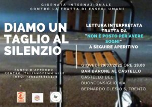 Il Progetto Alba, attraverso la cooperativa Punto d’Approdo e il Centro Italiano Femminile sezione di Trento, organizza per giovedì 29 Luglio, dalle 18 in via Bernardo Clesio 5 a Trento (presso il bar Barone al Castello del Buonconsiglio), l’evento di sensibilizzazione “Diamo un taglio al silenzio”, durante il quale verranno letti alcuni passi di “Non è posto per avere sogni”, una serie di racconti nati dall’incontro tra l’associazione LULE e INC (Itinerari Narrativi Contemporanei) – Lombardia.
