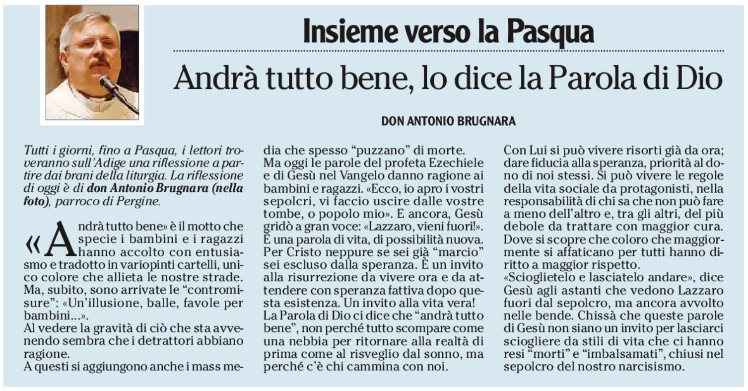 Ma oggi le parole del profeta Ezechiele e di Gesù nel Vangelo danno ragione ai bambini e ragazzi. «Ecco, io apro i vostri sepolcri, vi faccio uscire dalle vostre tombe, o popolo mio». E ancora, Gesù gridò a gran voce: «Lazzaro, vieni fuori!». È una parola di vita, di possibilità nuova. Per Cristo neppure se sei già “marcio” sei escluso dalla speranza. È un invito alla risurrezione da vivere ora e da attendere con speranza fattiva dopo questa esistenza. Un invito alla vita vera!