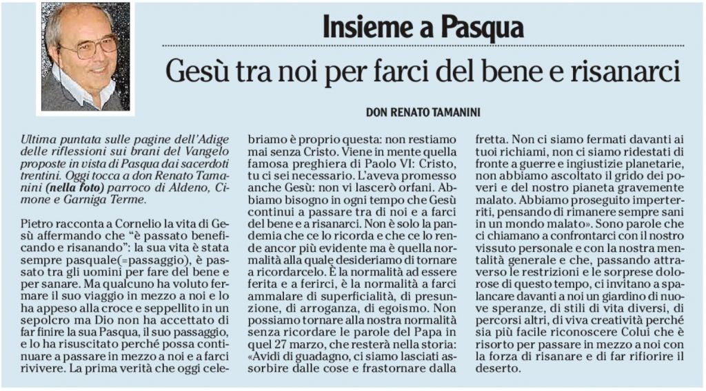 Pietro racconta a Cornelio la vita di Gesù affermando che “è passato beneficando e risanando”: la sua vita è stata sempre pasquale(=passaggio), è passato tra gli uomini per fare del bene e per sanare. Ma qualcuno ha voluto fermare il suo viaggio in mezzo a noi e lo ha appeso alla croce e seppellito in un sepolcro ma Dio non ha accettato di far finire la sua Pasqua, il suo passaggio, e lo ha risuscitato perché possa continuare a passare in mezzo a noi e a farci rivivere. La prima verità che oggi celebriamo è proprio questa: non restiamo mai senza Cristo. Viene in mente quella famosa preghiera di Paolo VI: Cristo, tu ci sei necessario. L’aveva promesso anche Gesù: non vi lascerò orfani. Abbiamo bisogno in ogni tempo che Gesù continui a passare tra di noi e a farci del bene e a risanarci. Non è solo la pandemia che ce lo ricorda e che ce lo rende ancor più evidente ma è quella normalità alla quale desideriamo di tornare a ricordarcelo. È la normalità ad essere ferita e a ferirci, è la normalità a farci ammalare di superficialità, di presunzione, di arroganza, di egoismo. Non possiamo tornare alla nostra normalità senza ricordare le parole del Papa in quel 27 marzo, che resterà nella storia: «Avidi di guadagno, ci siamo lasciati assorbire dalle cose e frastornare dalla fretta. Non ci siamo fermati davanti ai tuoi richiami, non ci siamo ridestati di fronte a guerre e ingiustizie planetarie, non abbiamo ascoltato il grido dei poveri e del nostro pianeta gravemente malato. Abbiamo proseguito imperterriti, pensando di rimanere sempre sani in un mondo malato». Sono parole che ci chiamano a confrontarci con il nostro vissuto personale e con la nostra mentalità generale e che, passando attraverso le restrizioni e le sorprese dolorose di questo tempo, ci invitano a spalancare davanti a noi un giardino di nuove speranze, di stili di vita diversi, di percorsi altri, di viva creatività perché sia più facile riconoscere Colui che è risorto per passare in mezzo a noi con la forza di risanare e di far rifiorire il deserto.