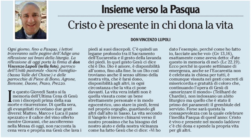 In questo Giovedì Santo si fa memoria dell’Ultima Cena di Gesù con i discepoli prima della sua morte e risurrezione. Di quella sera, gli evangelisti ricordano due gesti diversi: Matteo, Marco e Luca il pane spezzato e il calice del vino offerto mentre Giovanni, che ascolteremo nella Messa di oggi, non racconta la cena vera e propria ma Gesù che lava i piedi ai suoi discepoli. C’è quindi un legame profondo tra il Sacramento dell’Eucarestia e il gesto della lavanda dei piedi. In quel gesto Gesù ci dice chi è Dio. Dio è amore, è disponibilità all’uomo, fino alla fine. In un Dio così troviamo anche il senso ultimo della nostra vita, che è farsi dono, disponibilità agli altri, in ogni circostanza che la vita ci pone davanti. La vita vera infatti non è quella vissuta come un bene strettamente personale e in modo egocentrico, uno stare in piedi, fermi nel proprio orgoglio, guardando gli altri dall’alto in basso. La vita secondo il Vangelo è invece chinarsi verso il nostro prossimo che ha bisogno del nostro aiuto e della nostra vicinanza come ha fatto Gesù che ci dice: «Vi ho dato l’esempio, perché come ho fatto io, facciate anche voi» (Gv 13,16), esattamente come aveva detto: «Fate questo in memoria di me!» (Lc 22,19). Ecco perché in queste settimane di emergenza, anche se l’Eucarestia non è celebrata in chiesa per tutti, è comunque vissuta nei gesti concreti di misericordia e gratuità di coloro che, continuando l’opera di Gesù di «amorizzare il mondo» (Teilhard de Chardin), non indossano un abito liturgico ma quello che è stato il primo dei paramenti: il grembiule del servizio. Forse sarà questa la consapevolezza con la quale celebrare l’inedita Pasqua di quest’anno: Cristo è vivo e presente nel mondo laddove c’è chi dona e spende la propria vita per gli altri.