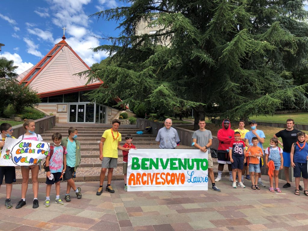 Conclusione a sorpresa del “grest” per quarantacinque ragazzi di elementari e medie delle parrocchie di Madonna Bianca e San Rocco a Trento, accompagnati da una trentina di animatori e dal parroco don Michele Vulcan. Nella tarda mattinata di venerdì 17 luglio hanno infatti ricevuto la visita dell’arcivescovo Lauro Tisi che li ha idealmente abbracciati davanti al piazzale della chiesa di Madonna Bianca, raccogliendo anche le loro testimonianze sulla felice esperienza estiva, pur segnata dalle limitazioni dettate dell’emergenza.
