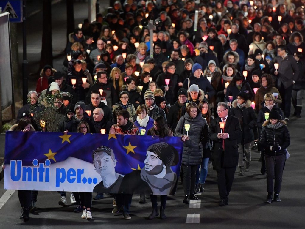 A seguire la fiaccolata con più di trecento persone in cammino silenzioso dalla chiesa di Cristo Re verso il Dipartimento di Lettere dell’Università. Lungo il tragitto due soste con la lettura di altrettanti testi: davanti alla casa di Antonio e in piazza Dante dove è stato riproposto un racconto pacifista firmato dal 29 enne reporter innamorato dell’Europa. Lo striscione “Uniti per”, con i volti dei due giovani uccisi a Strasburgo  sullo sfondo della bandiera europea, e l’ulivo portato in corteo sono stati poi lasciati all’interno dell’Università.