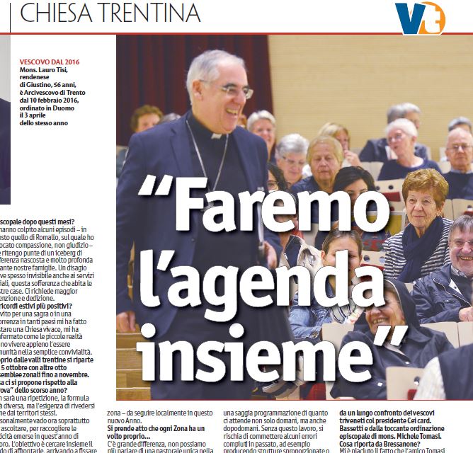 “Dovremo impegnarci a sviluppare al massimo l’incontro comunitario con la Parola. Il mio sogno è che attraverso questo lavoro nella diocesi di Trento la Parola di Dio, proposta dell’umanità di Gesù Cristo, sia letta e frequentata notte e giorno!”. Mons. Lauro Tisi esprime con questa parole la sua priorità pastorale all’inizio del nuovo Anno pastorale – il quarto per lui da vescovo di Trento – in un lungo colloquio con Vita Trentina in edicola oggi, durante il quale “rilegge” gli eventi dell’estate (“ho trovato nei piccoli paesi una Chiesa molto vivace”), incoraggia il percorso delle otto Assemblee pastorali di Zone (“insieme fisseremo l’agenda per i mesi successivi, io starò in ascolto) e affronta anche alcune critiche: sui migranti (“l’accoglienza è nel DNA del cristiano”, ripete), sui beni della Chiesa (“la sobrietà è criterio evangelico”) e sull’umanità di Gesù: “Quando parlo di umanità di Gesù mi riferisco all’unico che può fregiarsi del titolo di pienamente uomo. La nostra umanità, anche quella dei migliori, compresi quanti veneriamo come santi, presenta peccati, lacune e ferite. Viceversa, quando ho esplorato l’umano di Gesù Cristo incontro la pienezza del divino”. Poi spiega come intende coniugare i tre verbi cari a Papa Bergoglio: attirare alla fede, avviare i processi, accompagnare il popolo di Dio.