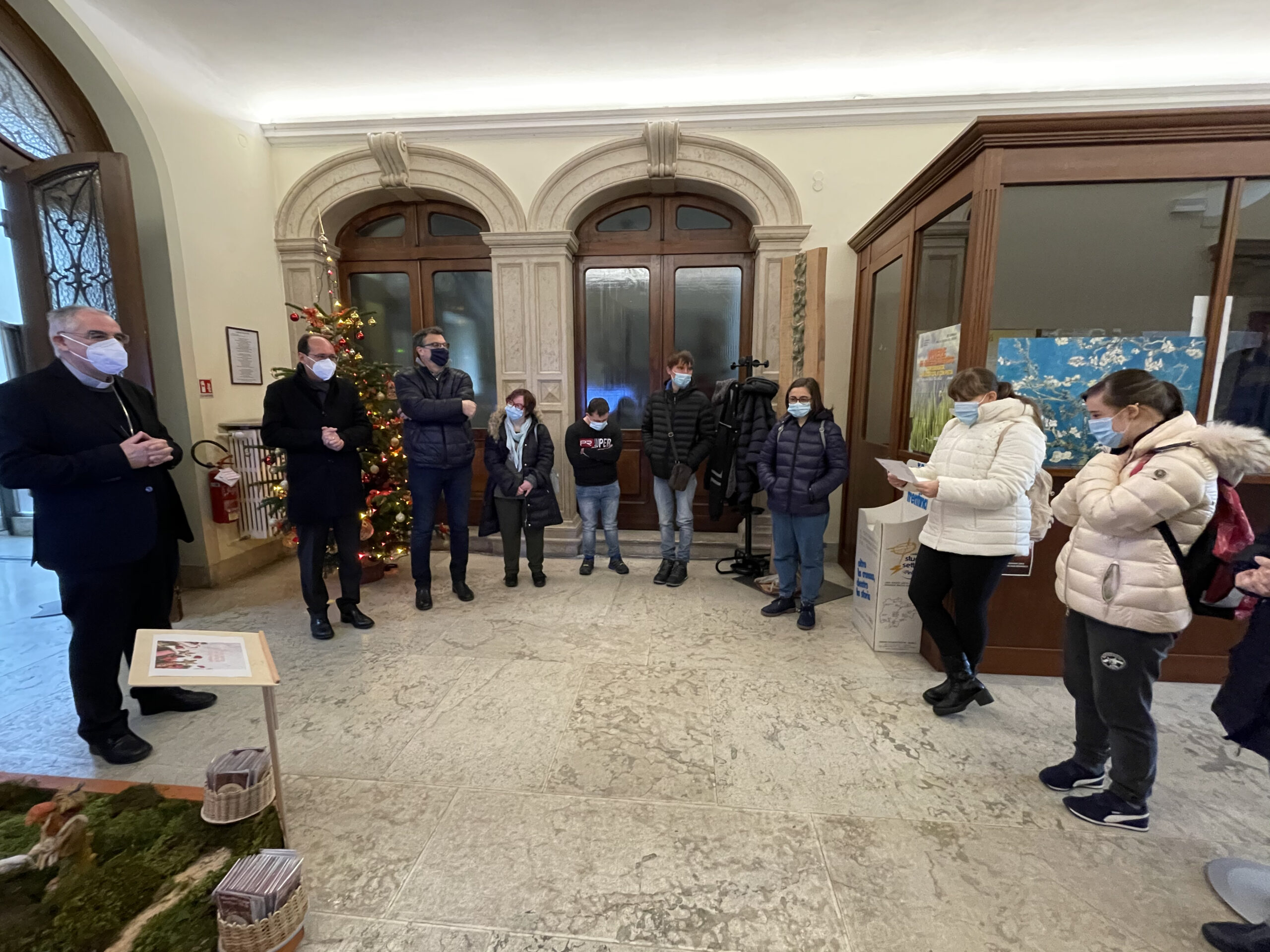 “Grazie perché ci donate speranza”: così il vescovo Lauro ha voluto ringraziare i ragazzi ed educatori di Anffas (progetto Per.La., percorso lavoro) che hanno realizzato il presepio e l’albero di Natale nell’atrio di Curia, in piazza Fiera. Nel breve momento di inaugurazione e benedizione del presepio, nella mattinata di mercoledì 2 dicembre, il vescovo ha avuto parole di elogio per il lavoro svolto dai ragazzi, che quest’anno hanno anche realizzato delle decorazioni in legno che saranno distribuite ai dipendenti della Curia in occasione del Natale, invitandoli a proseguire anche in futuro con questa iniziativa, che si affianca anche a quella di cura del piccolo orto, nel giardino dell’episcopio.