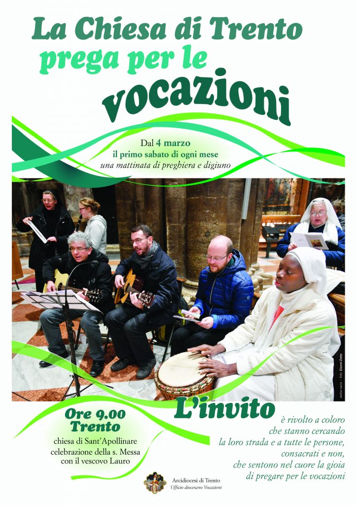 Con sabato 4 marzo 2017 inizia un’importante esperienza di preghiera per le vocazioni nella nostra Diocesi. Il vescovo Lauro ha infatti accolto con gioia la proposta della pastorale vocazionale di dedicare il primo sabato di ogni mese ad una mattinata di digiuno e di preghiera per le vocazioni con una Santa Messa alle ore 9.00 presso la Chiesa di Sant’Apollinare a Trento.