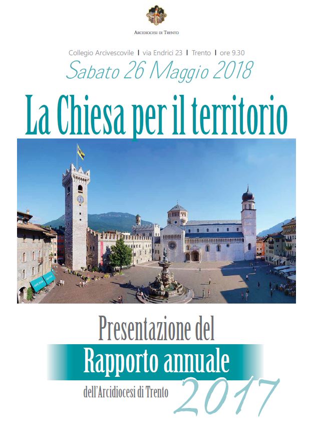 La presentazione del Rapporto 2017, dal titolo “La Chiesa per il territorio” è in programma sabato 26 maggio al Collegio Arcivescovile di Trento (via Endrici, 23), con inizio alle ore 9.30. Sono stati invitati, in particolare, i membri dei Consigli per gli affari economici di tutte le parrocchie della Diocesi.