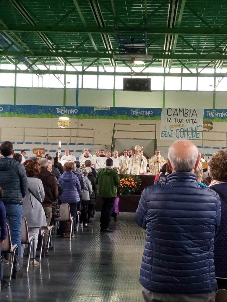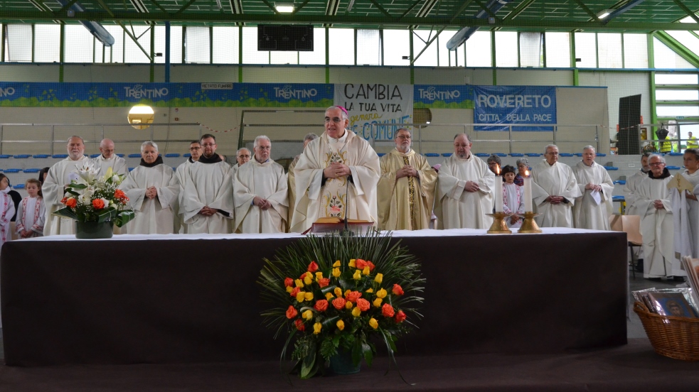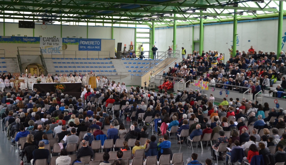 “La Missione, non si chiude, continua: Da questo sapranno che siete miei discepoli: se avete amore gli uni per gli altri (Gv 13, 35)”. Nel palazzetto dello sport di Rovereto, davanti a circa mille persone, l’Arcivescovo Lauro invita a rileggere i frutti della Missione al Popolo “lanciata” il 27 aprile scorso, puntando lo sguardo oltre l’evento che ha coinvolto sei parrocchie roveretane, “visitate” da un centinaio di missionarie e missionari (in particolare religiose e religiosi, ospitati in gran parte nelle famiglie). A tutti coloro che sono stati coinvolti il vescovo esprime un grande grazie e poi sottolinea: “Alcuni chiamano amore i gesti di solidarietà verso persone in difficoltà, altri parlano dell’amore come condivisione o partecipazione ai problemi degli altri”. Tuttavia, l’Amore di Gesù va oltre. “Amare – sottolinea il vescovo – è commuoversi per l’esistenza dell’altro. E’ scoprire che l’altro ci dà il gusto di vivere, di sognare, l’altro non è semplicemente il destinatario del mio amore, è l’incanto che mi fa esistere”. Don Lauro invita ad evitare la contrapposizione tra fede e vita, in nome di una presunta concretezza che sarebbe il segno distintivo della vita, mentre la fede porterebbe sul terreno dell’evasione dal reale, per aderire ad astratte teorie. Niente di più falso. I discepoli di Gesù di Nazareth non hanno scampo “Amatevi gli uni gli altri”. Il nostro Dio è tutta concretezza: ha i calli sulle mani, lava piedi, asciuga lacrime, spezza il pane. I giorni della Missione – conclude – sono stati accompagnati dalla preghiera delle nostre sorelle clarisse; provocazione profetica a regalarci il silenzio orante per prendere in mano la Parola e conoscere l’entusiasmante Bellezza del nostro Dio”. (Qui scarica testo integrale omelia Conclusione della missione al popolo Rovereto)