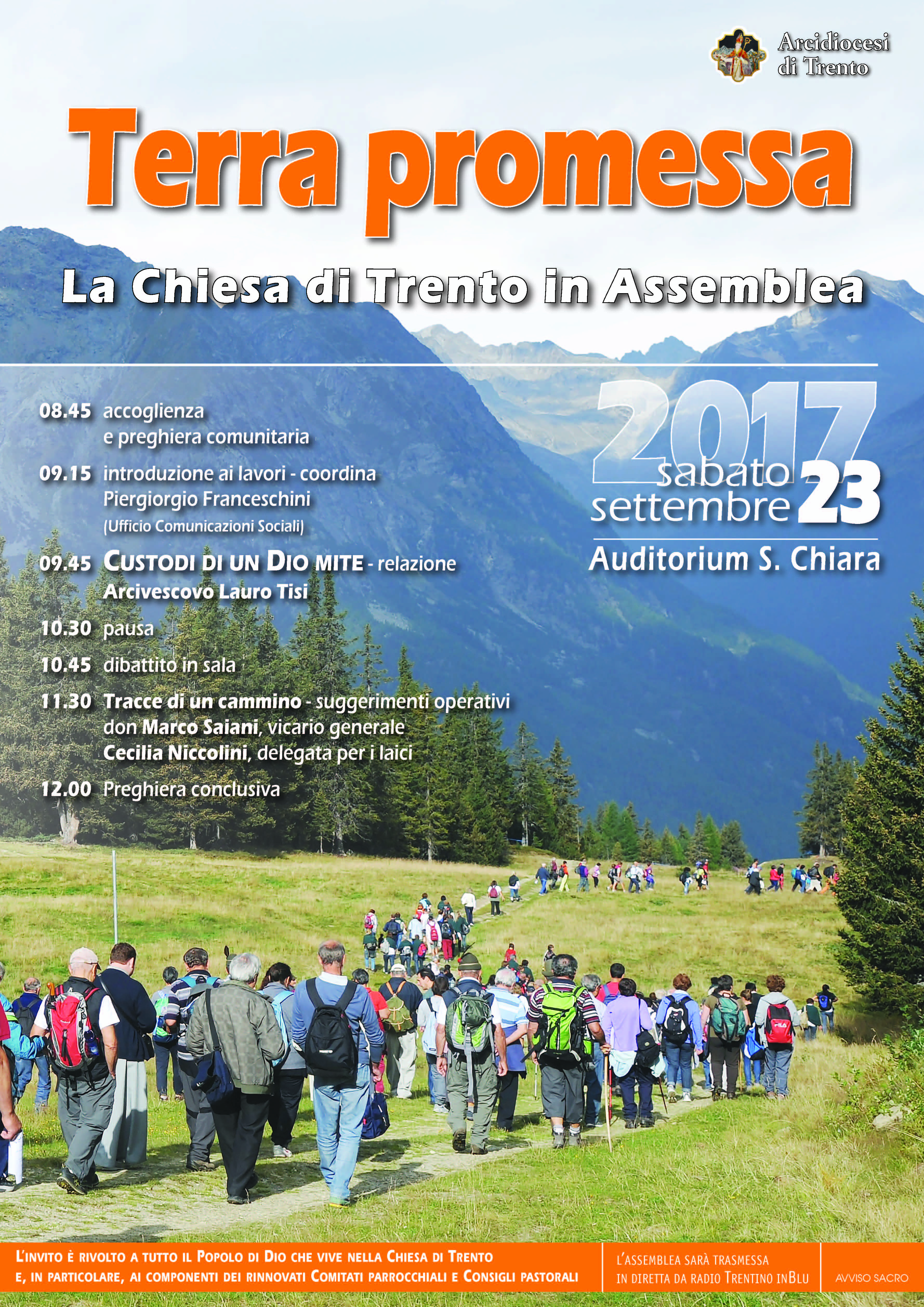Il titolo “Terra promessa” e la foto di un popolo in cammino. Una sorta di Esodo contemporaneo è l'”icona” che accompagna l’assemblea diocesana di sabato 23 settembre, tradizionale inizio dell’anno pastorale. L’appuntamento  è dalle ore 8.45 alle 12 presso l’Auditorium S. Chiara di Trento. Ai lavori, introdotti  da Piergiorgio Franceschini (Ufficio Comunicazioni), sono invitati quest’anno, in particolare, i componenti dei comitati parrocchiali  e dei consigli pastorali. L’Arcivescovo Lauro rifletterà sul tema “Custodi di un Dio mite”, preludio al dibattito in sala e ai suggerimenti operativi a cura del vicario generale don Marco Saiani e della delegata per i laici Cecilia Niccolini. Diretta su radio Trentino inBlu.