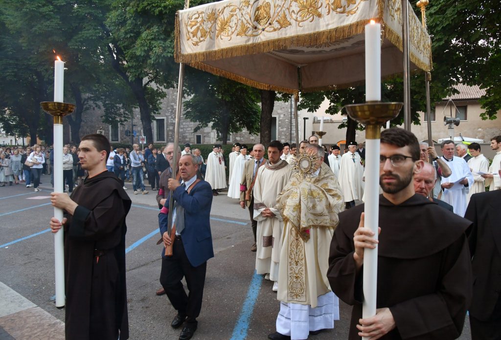Giovedì 15 giugno si è svolta a Trento la tradizionale processione del Corpus Domini, che anticipa la solennità di domenica 18 giugno, in cui la Chiesa proclama la fede nella presenza reale di Gesù nel pane eucaristico. In cattedrale la concelebrazione dell’Eucaristia presieduta dall’arcivescovo Lauro. Dal Duomo è partita poi la processione (il vescovo con l’ostensorio con il pane eucaristico) su via Garibaldi, via San Vigilio, via Mazzini, piazza Fiera, via Santa Croce, fino alla chiesa del Santissimo in corso Tre Novembre, dove è stata impartita dal vescovo la benedizione eucaristica. Alla celebrazione erano invitati quest’anno, in particolare, i ministri straordinari dell’eucarestia, donne e uomini che aiutano i parroci nel portare la comunione in casa di ammalati e anziani. In processione, inoltre, ritorneranno anche quest’anno bambine e bambini che hanno ricevuto da poco la Prima Comunione, adolescenti della Cresima, chierichetti, sacerdoti, religiosi e religiose, associazioni diocesane. Il Corpus Domini è una solennità molto sentita soprattutto nelle valli, dove sopravvivono tradizioni secolari con le processioni eucaristiche per le vie dei paesi. Anche in città l’appuntamento ha fatto registrare negli ultimi anni una partecipazione crescente.