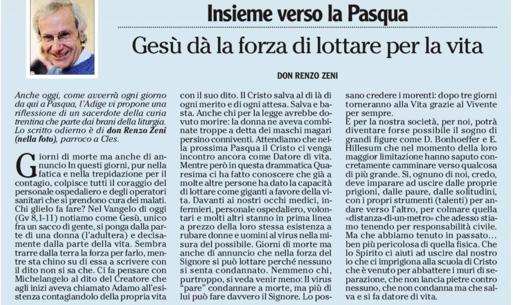 Giorni di morte ma anche di annuncio In questi giorni, pur nella fatica e nella trepidazione per il contagio, colpisce tutti il coraggio del personale ospedaliero e degli operatori sanitari che si prendono cura dei malati. Chi glielo fa fare? Nel Vangelo di oggi (Gv 8,1-11) notiamo come Gesù, unico fra un sacco di gente, si ponga dalla parte di una donna (l’adultera) e decisamente dalla parte della vita. Sembra trarre dalla terra la forza per farlo, mentre sta chino su di essa a scrivere con il dito non si sa che. Ci fa pensare con Michelangelo al dito del Creatore che agli inizi aveva chiamato Adamo all’esistenza contagiandolo della propria vita con il suo dito. Il Cristo salva al di là di ogni merito e di ogni attesa. Salva e basta. Anche chi per la legge avrebbe dovuto morire: la donna ne aveva combinate troppe a detta dei maschi magari persino conniventi. Attendiamo che nella prossima Pasqua il Cristo ci venga incontro ancora come Datore di vita. Mentre però in questa drammatica Quaresima ci ha fatto conoscere che già a molte altre persone ha dato la capacità di lottare come giganti a favore della vita. Davanti ai nostri occhi medici, infermieri, personale ospedaliero, volontari e molti altri stanno in prima linea a prezzo della loro stessa esistenza a rubare donne e uomini al virus nella misura del possibile. Giorni di morte ma anche di annuncio che nella forza del Signore si può lottare perché nessuno si senta condannato. Nemmeno chi, purtroppo, si veda venir meno: Il virus “pare” condannare a morte, ma più di lui può fare davvero il Signore. Lo possano credere i morenti: dopo tre giorni torneranno alla Vita grazie al Vivente per sempre.
