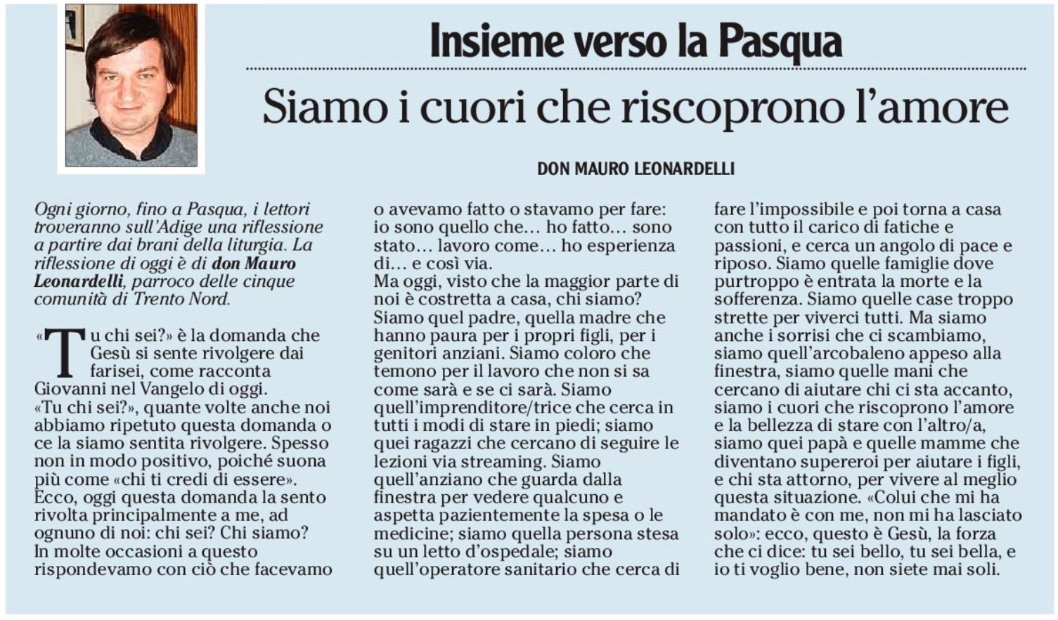 Siamo quel padre, quella madre che hanno paura per i propri figli, per i genitori anziani. Siamo coloro che temono per il lavoro che non si sa come sarà e se ci sarà. Siamo quell’imprenditore/trice che cerca in tutti i modi di stare in piedi; siamo quei ragazzi che cercano di seguire le lezioni via streaming. Siamo quell’anziano che guarda dalla finestra per vedere qualcuno e aspetta pazientemente la spesa o le medicine; siamo quella persona stesa su un letto d’ospedale; siamo quell’operatore sanitario che cerca di fare l’impossibile e poi torna a casa con tutto il carico di fatiche e passioni, e cerca un angolo di pace e riposo. Siamo quelle famiglie dove purtroppo è entrata la morte e la sofferenza. Siamo quelle case troppo strette per viverci tutti. Ma siamo anche i sorrisi che ci scambiamo, siamo quell’arcobaleno appeso alla finestra, siamo quelle mani che cercano di aiutare chi ci sta accanto, siamo i cuori che riscoprono l’amore e la bellezza di stare con l’altro/a, siamo quei papà e quelle mamme che diventano supereroi per aiutare i figli, e chi sta attorno, per vivere al meglio questa situazione. «Colui che mi ha mandato è con me, non mi ha lasciato solo»: ecco, questo è Gesù, la forza che ci dice: tu sei bello, tu sei bella, e io ti voglio bene, non siete mai soli.