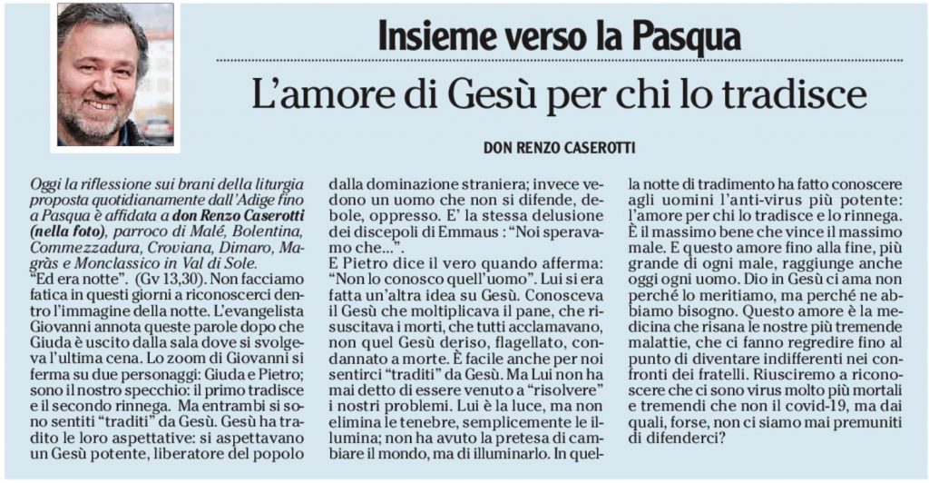 “Ed era notte”. (Gv 13,30). Non facciamo fatica in questi giorni a riconoscerci dentro l’immagine della notte. L’evangelista Giovanni annota queste parole dopo che Giuda è uscito dalla sala dove si svolgeva l’ultima cena. Lo zoom di Giovanni si ferma su due personaggi: Giuda e Pietro; sono il nostro specchio: il primo tradisce e il secondo rinnega. Ma entrambi si sono sentiti “traditi” da Gesù. Gesù ha tradito le loro aspettative: si aspettavano un Gesù potente, liberatore del popolo dalla dominazione straniera; invece vedono un uomo che non si difende, debole, oppresso. E’ la stessa delusione dei discepoli di Emmaus : “Noi speravamo che…”.