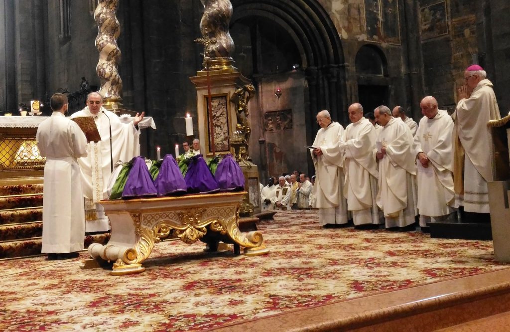 In cattedrale anche molti laici e in particolare quasi duecento ragazzi cresimandi provenienti da diversi angoli del Trentino, a cominciare dalla Rendena, la valle del vescovo Lauro. “Rappresentate tutto il grande popolo di Dio che ringraziamo – ha detto monsignor Tisi in apertura – per la collaborazione e la creatività che sta mostrando nelle nostre comunità, nonostante le difficoltà”. Nell’omelia le elenca: “Assemblee eucaristiche disertate, strutture ormai sproporzionate della nostra pastorale, la fatica a trovare collaboratori, gli acciacchi dell’età…”. Ma non sono questi, secondo l’Arcivescovo, i parametri per leggere l’oggi della Chiesa: “Il Regno di Dio non si misura con l’imponenza dei numeri, delle strutture, con il sentirsi al centro della mappa del potere. Il Regno si nutre, al contrario, di gesti nascosti, di tanti uomini e donne che, nel silenzio umile, asciugano lacrime. Ma quelle altrui, non le proprie”. Di qui l’invito ai preti ad essere “ministri della fraternità e della prossimità di Dio”: “La nostra gente ci possa trovare accanto al letto dell’ammalato, seduti ad ascoltare storie di fatica e desolazione, impegnati a riaprire porte di riconciliazione”. A conclusione, tornando a parlare ai ragazzi, Tisi ha ricordato la comunità di Cles colpita negli ultimi tempi dalla perdita di due quindicenni molto attivi anche in parrocchia: Giulia, stroncata da un male incurabile e Mirko, vittima pochi giorni fa di un incidente in moto.