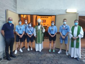 L’Arcivescovo con un gruppo di giovani scout. Ai lati don Dario e don Mattia