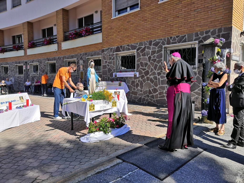 Nella foto il vescovo Lauro l’estate scorsa davanti all’Apsp di Spiazzo.