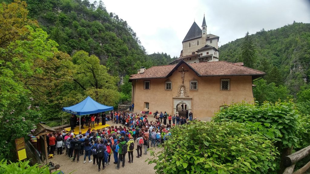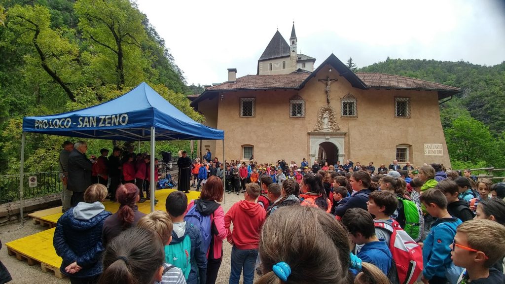 Santuario di San Romedio animato da ben 160 bambini delle elementari della val di Non venerdì 28 maggio per l’inaugurazione dell’esposizione “Passi di Pace”, alla presenza dell’arcivescovo Lauro Tisi, del Priore di s. Romedio p. Giorgio Silvestri, dei rappresentanti di altre confessioni religiose e dei sindaci delle zone coinvolte. Si tratta di un lavoro che ha visto coinvolti nei mesi scorsi i bambini delle classi quinte elementari dei 3 istituti comprensivi della Val di Non. Ad ogni classe è stata affidata la realizzazione di un pannello dedicato ad un personaggio insignito del Nobel per la pace. I pannelli poi sono stati realizzati e stampati col patrocinio della Cassa Rurale Val di Non e da martedì 28 sono collocati lungo la scalinata esterna dell’ultimo tratto che conduce al Santuario. Un messaggio di Pace che accoglierà i visitatori: i pannelli rimarranno infatti esposti al pubblico per tutta l’estate. i bambini hanno motivato le loro scelte, mentre l’arcivescovo dopo una riflessione sul tema della pace, insieme agli altri invitati, ha liberato in volo il simbolo pacifico ed eloquente di tre colombe.