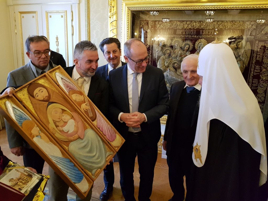 A suggello della mostra dei presepi trentini eccezionalmente esposti a Mosca, una delegazione guidata dall’arcivescovo emerito monsignor Luigi Bressan e dal governatore Ugo Rossi ha incontrato il patriarca di Mosca e di tutte le Russie, sua santità Kirill. L’arte e la tradizione dei presepi trentini è uno strumento per avvicinare i popoli, ha detto Kirill accogliendo la delegazione nel monastero Danilovskij a Mosca. L’incontro ha di fatto suggellato l’iniziativa promossa dall’associazione Amici del presepio di Tesero, sostenuta dalla Regione Trentino Alto Adige Südtirol, che ha visto esposto nella Basilica di Cristo Salvatore (fino al termine della settimana) 23 rappresentazioni della natività frutto della maestria degli artigiani trentini ed altoatesini. La mostra ha ottenuto il patrocinio del Pontificio Consiglio per l’Unità dei Cristiani accanto a quello del Patriarcato di Mosca e di tutte le Russie, ed ha potuto contare sulla collaborazione delle Province autonome di Trento e di Bolzano, dell’Arcidiocesi di Trento, della Comunità di Sant’Egidio. Ideata ed allestita dall’ Associazione Amici del Presepio di Tesero-Trento e l’Associazione Unika Val Gardena – Bolzano, ha beneficiato del supporto dell’ambasciatore a Mosca, Pasquale Terracciano. (foto Ufficio Stampa Provincia )