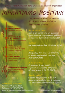 Il tempo che stiamo vivendo non ha permesso di organizzare anche per questo 2021 il corso dell’Esperienza Estiva in missione, iniziativa che il Centro Missionario della Diocesi di Trento propone da moltissimi anni. E’ sembrato però importante poter offrire comunque un corso che parta dalla stessa idea di percorso, sia personale che di gruppo, con la possibilità, se le condizioni dettate dalla pandemia lo permetteranno, di un’esperienza reale di cammino/servizio.