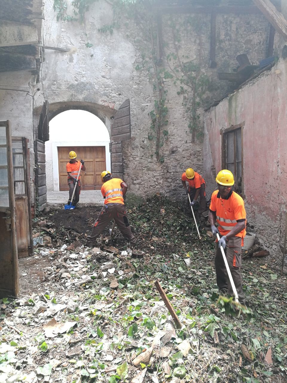 Per cominciare, l’immobile è stato liberato dalle macerie grazie al lavoro di un gruppo di volontari, compresi anche un architetto e un geometra. Per la pulizia degli spazi sono state impiegate sei persone, individuate tra coloro che chiedono aiuto al Fondo di Solidarietà decanale di Rovereto (che ha sostenuto ad oggi oltre 600 famiglie) e tra i richiedenti asilo, d’intesa con Cinformi. Hanno seguito un corso per la sicurezza e una volta formati si sono messi al lavoro per rendere accessibili gli spazi ora in attesa di essere completamente risanati.