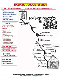 Ritorna anche quest’anno, e precisamente sabato 7 agosto, il pellegrinaggio a piedi da Sanzeno a Senale, organizzato dal Gruppo Samuele: è il 34° pellegrinaggio, inevitabilmente segnato da alcune limitazioni dettate dall’emergenza sanitaria .