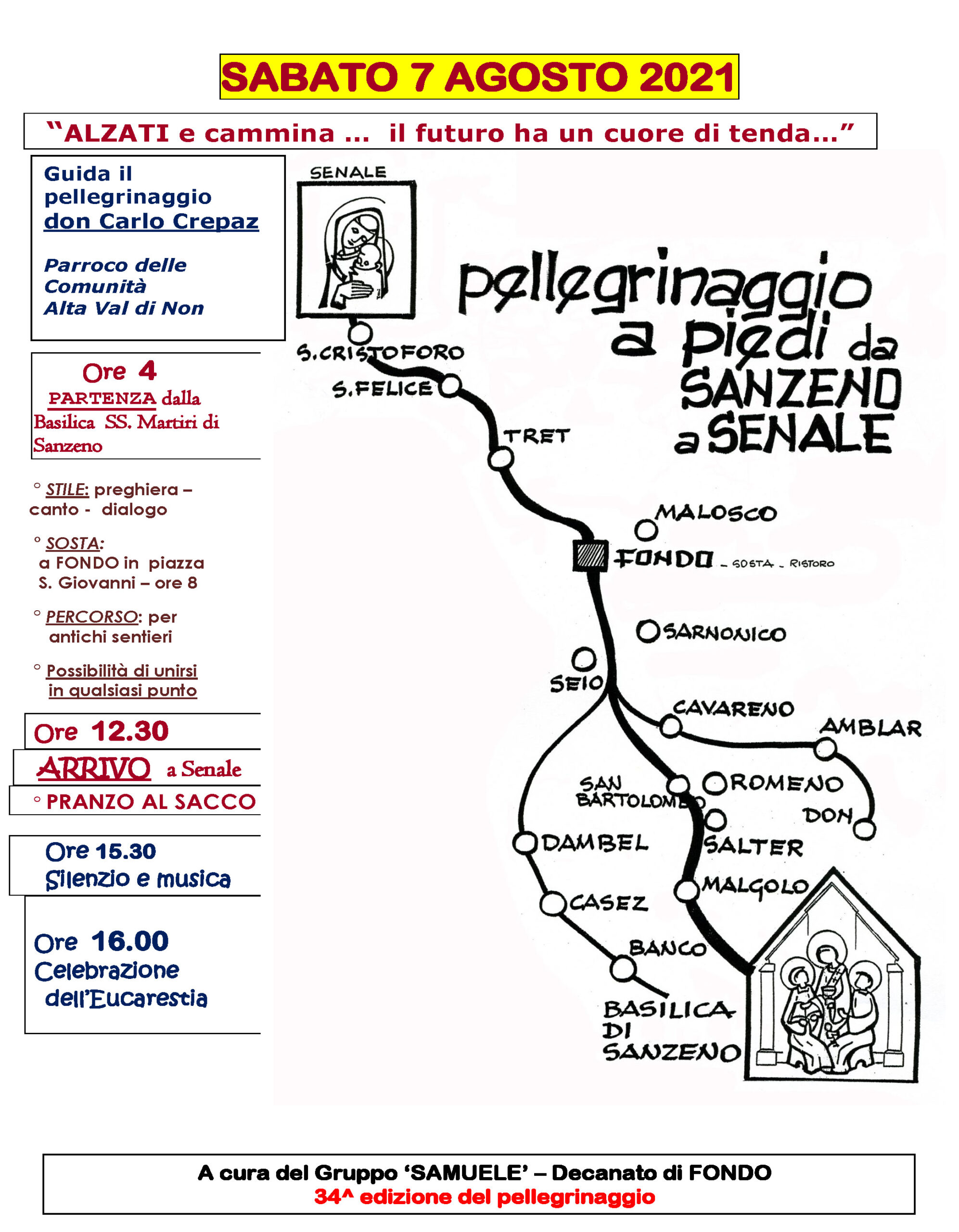 Ritorna anche quest’anno, e precisamente sabato 7 agosto, il pellegrinaggio a piedi da Sanzeno a Senale, organizzato dal Gruppo Samuele: è il 34° pellegrinaggio, inevitabilmente segnato da alcune limitazioni dettate dall’emergenza sanitaria .