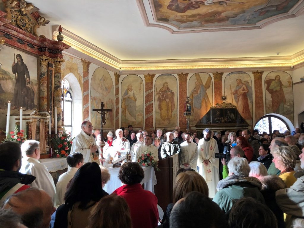 “Sempre più numerosi in cammino fin qui”, sottolinea padre Giorgio Silvestri, parroco di Sanzeno, ricordando che “il fenomeno San Romedio cresce ogni anno. Ne è prova – aggiunge – anche il fatto che in un anno sono stati compilati dai fedeli ben 50mila foglietti con le intenzioni di preghiera all’eremita”. La Messa solenne nel giorno della festa (alle ore 11, le altre alle 8 e alle 16), è stata presieduta dall’arcivescovo Lauro e concelebrata anche da padre Giovanni Voltan, provinciale dei frati minori conventuali del nord italia. Ad animare la liturgia, quest’anno, il coro di Tassullo che ha fatto risuonare – intonando in apertura il non usuale inno a San Romedio – le volte dell’antica chiesa arroccata nella parte più alta del santuario.