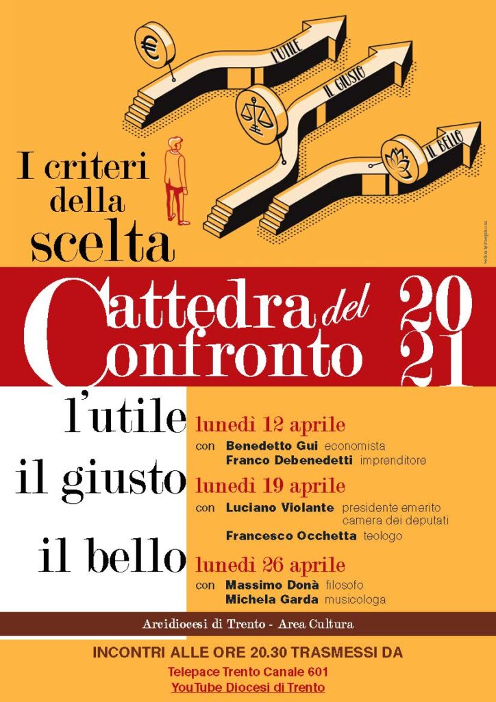 Quali sono i criteri che motivano le nostre scelte? L’utilità? Ciò che ci appare giusto? Oppure quello che giudichiamo bello? Sono le domande-guida al centro della Cattedra del Confronto: dopo un anno di sospensione causa pandemia, la proposta culturale della Chiesa trentina ritorna, seppure in versione telematica, ad animare le serate di tre lunedì successivi di aprile: 12, 19 e 26, alle ore 20.30.
