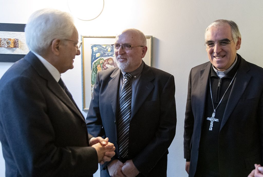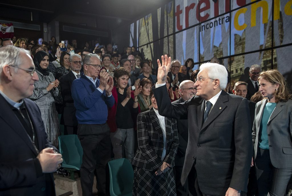 Trento – Il Presidente della Repubblica Sergio Mattarella con Mons. Lauro Tisi, Arcivescovo di Trento e Jesus Moran Cepedano, Co-Presidente del Movimento dei Focolari, in occasione della celebrazione in onore di Chiara Lubich, nel centenario della sua nascita, oggi 25 gennaio 2020