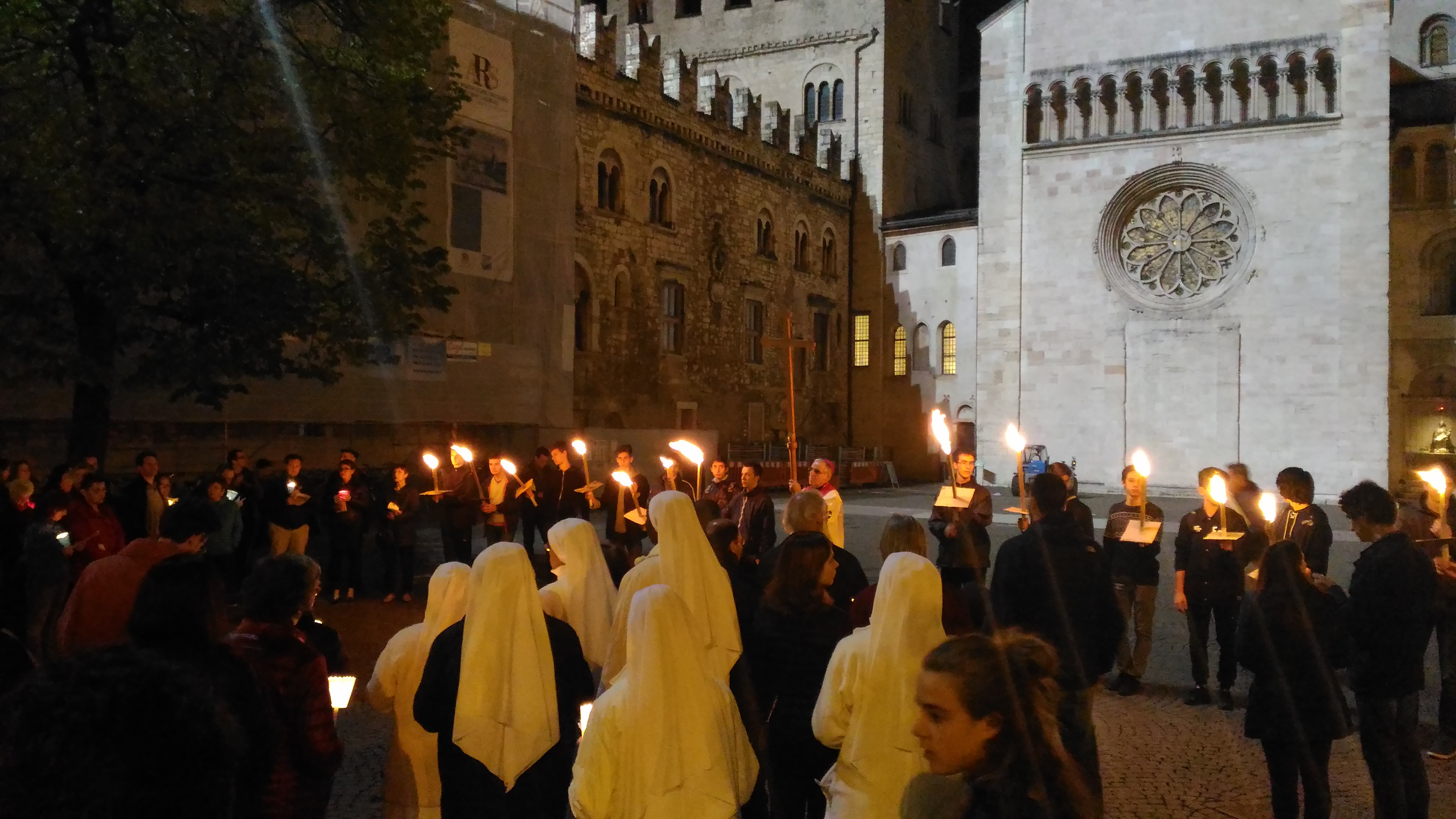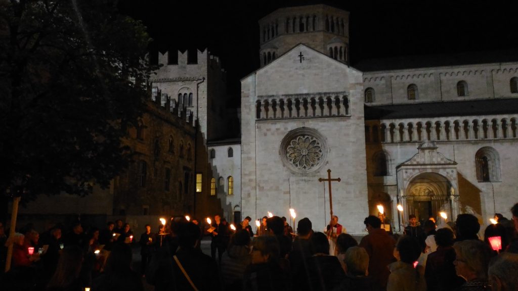 Almeno quattrocento persone, soprattutto giovani, hanno partecipato la sera di venerdì 7 aprile alla Via Crucis per le strade di Trento, guidata dal vescovo Lauro. Nelle sue mani la croce che ha preceduto la suggestiva processione dei fedeli con le fiaccole in mano, dalla chiesa di Sant’Antonio alla cattedrale. La Via Crucis era dedicata quest’anno al neo beato trentino padre Mario Borzaga. Le stazioni del rito hanno toccato luoghi significativi della vita del futuro missionario martire in Laos, a cominciare dalla casa natale in via Gorizia. Sono stati letti ampi stralci dei suoi scritti.