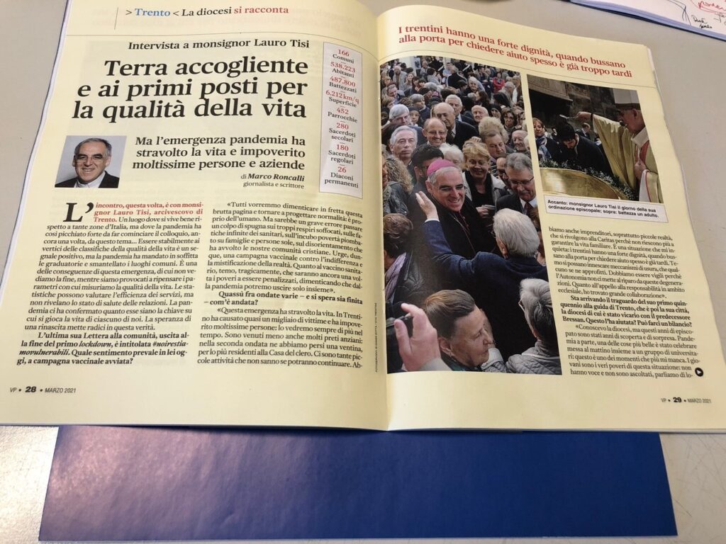 Una corposa “fotografia” della Diocesi di Trento e delle sue sfide pastorali, attraverso un’ampia intervista all’arcivescovo Lauro Tisi. La offre il numero di marzo del mensile Vita Pastorale, edito da San Paolo. L’intervista, a cura di Marco Roncalli e corredata dalle immagini di Gianni Zotta (Vita Trentina), prende le mosse dalle conseguenze pesanti della pandemia anche sul tessuto trentino (“I trentini – dice don Lauro – hanno una forte dignità, quando bussano alla porta per chiedere aiuto spesso è già troppo tardi”) per poi toccare alcuni temi chiave – dai giovani ai migranti, dalla riduzione del clero al futuro della pastorale – sui quali si è speso monsignor Tisi in questi primi cinque anni di episcopato, dopo essere stato per più di dieci anni vicario generale del vescovo Bressan. “C’è bisogno – sottolinea l’Arcivescovo di Trento, rilanciando un suo punto fermo – di raccontare Dio a partire dall’umanità di Gesù Cristo, e non in modo astratto e filosofico”. Ed aggiunge: “Credo sia necessario superare lo schema preti-laici, che è divisivo, per mettere al centro la vita della comunità”.