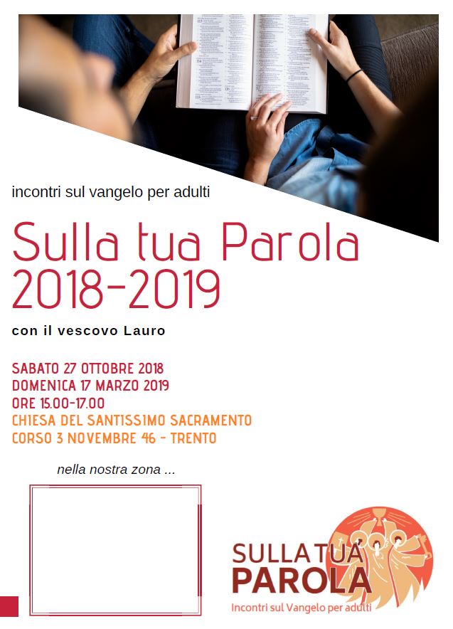 Domenica 17 marzo, dalle 15 alle 17, presso la chiesa del Santissimo Sacramento a Trento l’arcivescovo Lauro incontrerà gli adulti per il secondo appuntamento del 2018/2019 di Sulla Tua Parola. Il Vangelo al centro della riflessione sarà La risurrezione del figlio della vedova di Nain (Luca 7,11-17). Ai gruppi della Val Rendena è stato chiesto di riflettere sul testo evangelico e dalle loro riflessioni e domande prenderà le mosse l’intervento di don Lauro. Ad animare il momento di preghiera e riflessione sarà il coro di Madonna della Pace a Trento Nord.