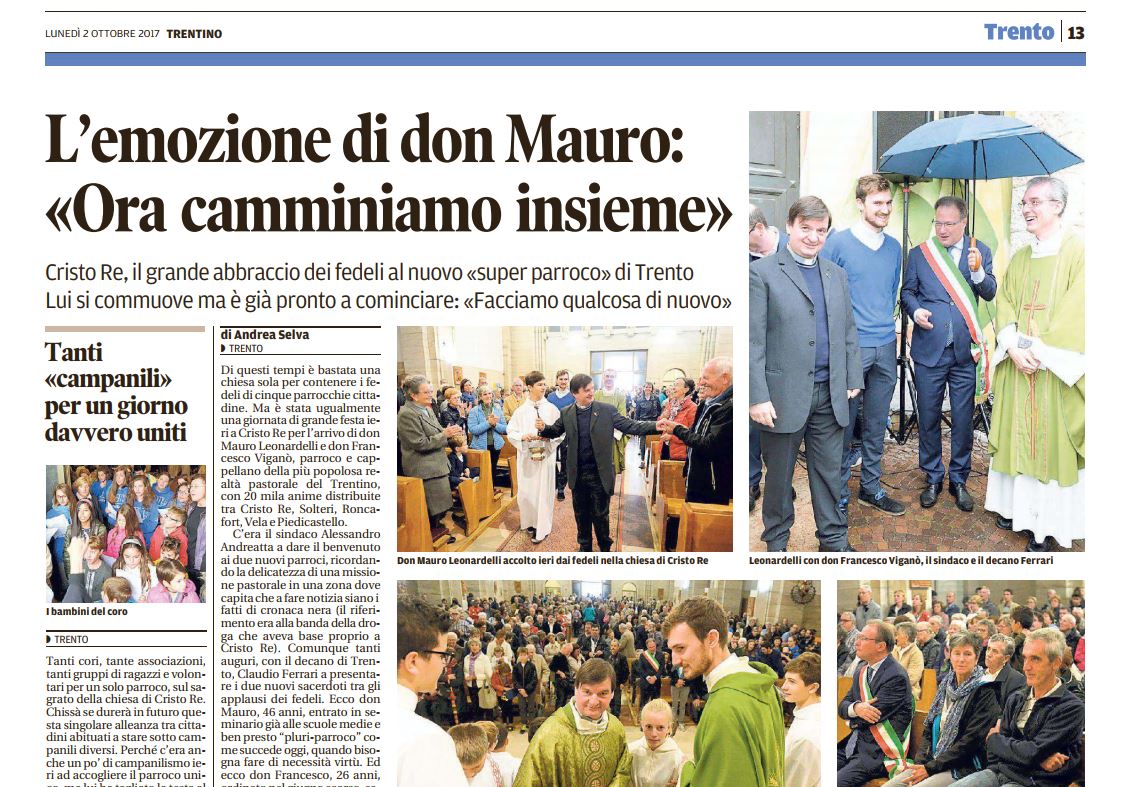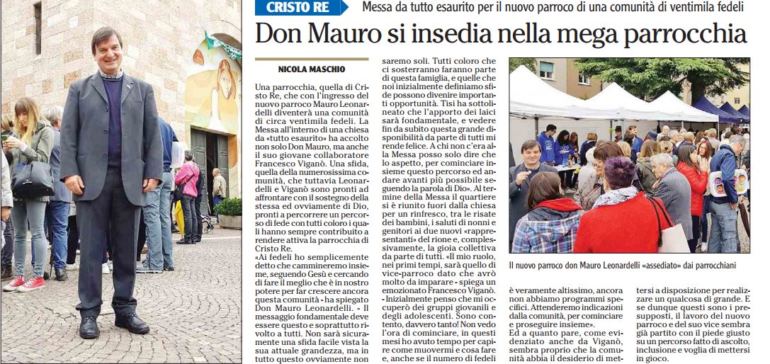Tra i tanti avvicendamenti autunnali tra parroci, ha destato (giustamente) attenzione mediatica l’ingresso domenica 1 ottobre, a Trento, nella chiesa di Cristo Re, del nuovo parroco don Mauro Leonardelli (da ultimo in Val di Non) e con lui del cappellano don Francesco Viganò (prete novello). Insieme guideranno 5 parrocchie (Cristo Re, Madonna della Pace e Vela, a cui si aggiungono da quest’anno Piedicastello e Solteri) per un bacino complessivo di 20 mila abitanti nella zona di Trento Nord. La prima realtà pastorale, sotto la guida di un unico parroco, così ampia in città e in Diocesi. Una bella sfida per le cinque comunità coinvolte. Una sfida che “in un ottica di corresponsabilità porta a dire – si legge nel bollettino parrocchiale – non due preti per ventimila anime, ma ventimila per due”.