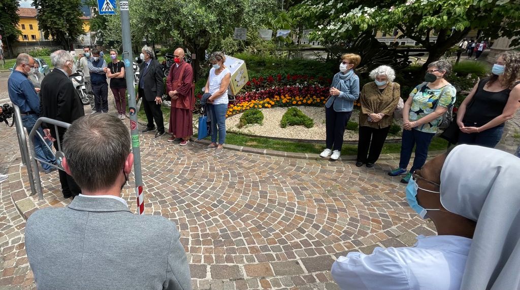 L’appuntamento, alla presenza anche del vescovo Lauro e di don Cristiano Bettega, delegato dell’Area Testimonianza e Impegno Sociale dell’Arcidiocesi, era alle 13 di oggi, martedì 8 giugno, in un luogo altrettanto simbolico quale l’aiuola della pace, che sorge fra piazza Fiera e piazza Garzetti, a fianco dell’episcopio.